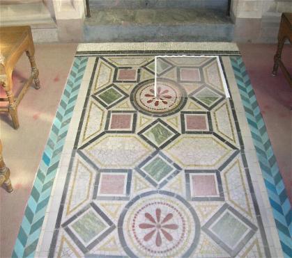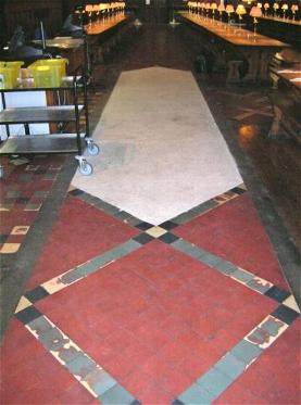 These images show the before & after of the Dining Hall floor at Keeble College, Oxford. A section of the tiled floor had been removed due to the deterioration of the caustic tiles by the entrance to the kitchen area. Obviously the floor was repaired with a concrete screed which left a far from desirable result. The floor is due to be completely relaid within 2 years, so we came up with a semi-permanent answer using our unique eyemats 'Conservation Floor Protection System'.